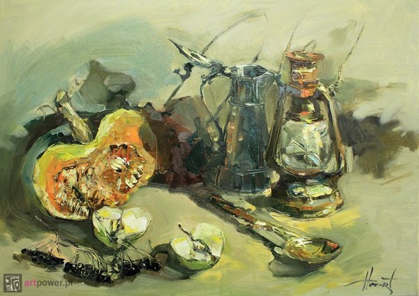 olej na płótnie, brak oprawy, boki pomalowane w kolorze pracy, sygnowane