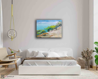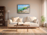 Obraz inspirowany wspomnieniem tureckiego wybrzeża, gdzie ciepłe powietrze miesza się z zapachem cedrów i morskiego wiatru. Delikatne światło i spokojny rytm natury tworzą atmosferę beztroskiego letniego dnia, w którym czas płynie wolniej.