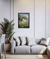 W tym pejzażu jest uchwycony moment cichego zachwytu nad jesienią – jej ciepłem, światłem i spokojem. Promienie słońca muskają korony sosen, nadając im złocisty blask, a w powietrzu czuć jeszcze echo lata. To obraz o harmonii i łagodnym przemijaniu, pełen świeżości, światła i oddechu natury.