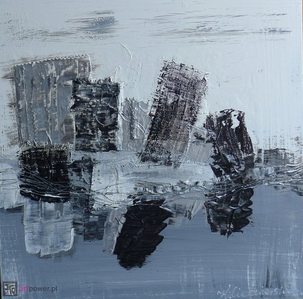 Obraz akrylowy, technika mieszana, podłoże płyta, przygotowany do powieszenia bez potrzeby ramy i dodatkowych mocowań, fakturalny, boki zamalowane w tonacji obrazu, werniksowany, sygnowany