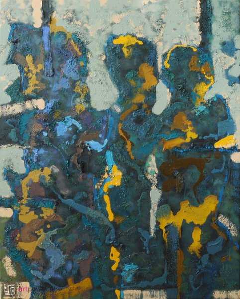 Obraz pt. „Spotkanie” wykonany został w technice olejnej na podobraziu płóciennym. Wymiary pracy 100 x 80 cm. Data powstania 2023 rok. Sygnowany na odwrocie - MBryndza’23. Boczne krawędzie płótna zostały zamalowane, obraz nie wymaga oprawy. Praca przygo