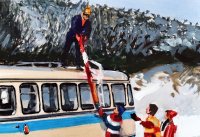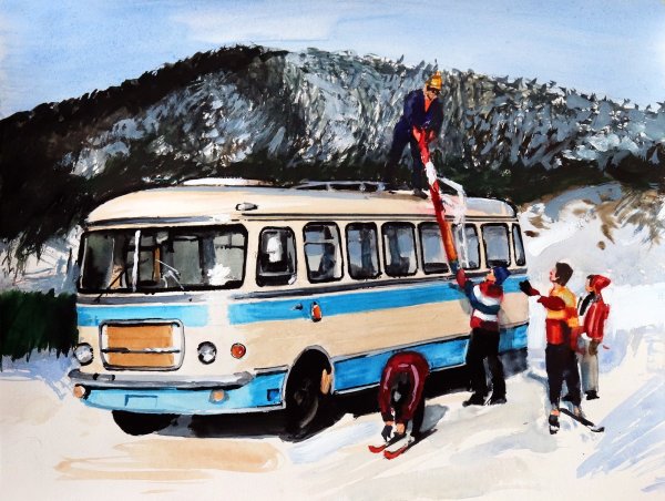 akwarela/gwasz na papierze, bez oprawy. Obraz na podstawie archiwalnego zdjęcia z lat 70-tych XX w. Przedstawia model popularnego w tamtych czasach autobusu typu San H 100A, który w tym przypadku używano jako autokar turystyczny.