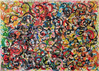 To dzieło sztuki to prawdziwa eksplozja kolorów i emocji. Feeria barw - od żywych czerwieni i pomarańczy, przez intensywna niebieskość, po głębokie czernie - tworzy chaotyczną, ale fascynującą kompozycję. W wirze zakręconych kształtów dostrzec można misterną plątaninę spiral i krzywych linii, które zdają się tańczyć na płótnie w nieskończonym rytmie. To dzieło wypełnia pokój energią i dynamiką, jakby krzyczało "Look at me!" Artysta zastosował technikę, która wydaje się być połączeniem spontanicznego street artu z finezją malarstwa olejnego. Chaos kręci się w sposób niemal hipnotyzujący, jakby samo chciało opowiedzieć jakąś historię. Praca ta może budzić różnorodne emocje - od radości po niepokój - zależnie od tego, jak długo przy niej stoimy. Obraz ten jest barwny, hałaśliwy i pełen życia.
