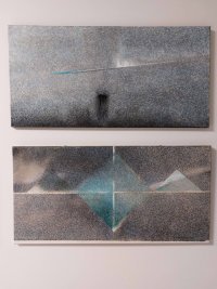 Obraz z cyklu MY SPACES - to cykl, gdzie dzieło w przeważającej mierze zbudowane jest z drobnych śladów zestawionych z płaskimi większymi plamami. Cykl przedstawia formy przedmiotów umieszczone w nieosiągalnej przestrzeni malarskiej oraz światło i cień, które malowane są z nawarstwiających się transparentnych drobnych pociągnięć pędzla lub kropek.