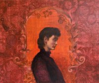 Obraz zainspirowany dawnym malarstwem o dekoracyjnym roślinnym motywem w tle. Obraz o wyraźnej i zdecydowanej kolorystyce z ciekawym dekorem okalającym portret kobiety.